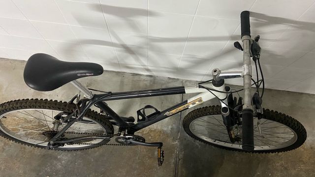 Bicicleta aro 26 com quadro em preto e branco. - Guidão com manoplas pretas. - Selim preto. - Pneus com cravos. - Porta-garrafa preta.