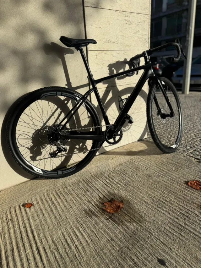 Detalhes do produtoBicicleta de gravel com quadro em carbono e transmissão SRAM Rival e apex.