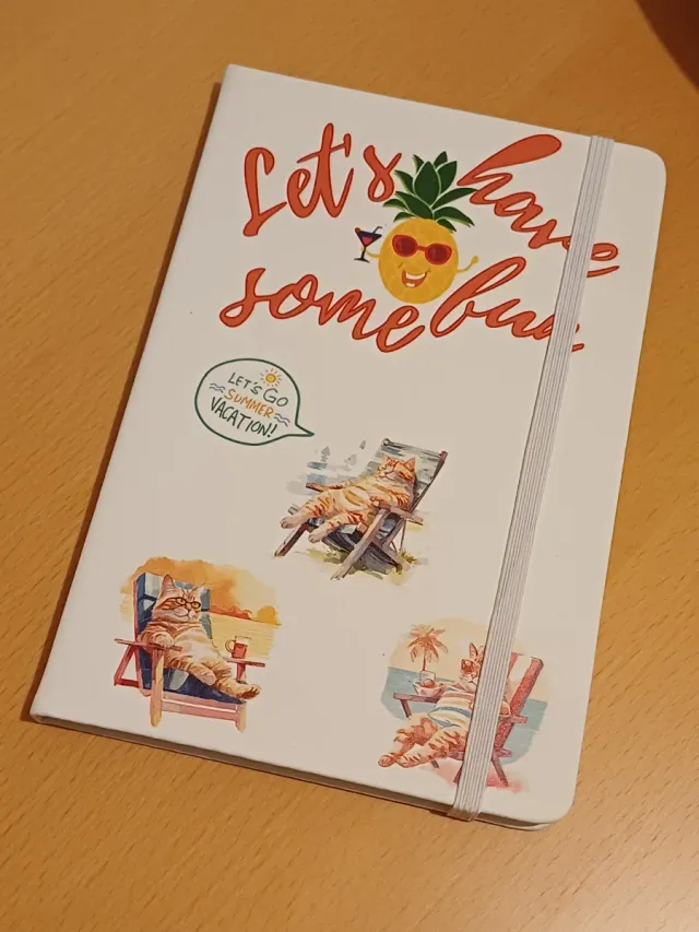 Detalhes do produtoCaderno A5 com capa divertida com tema de verão e gatos relaxando.