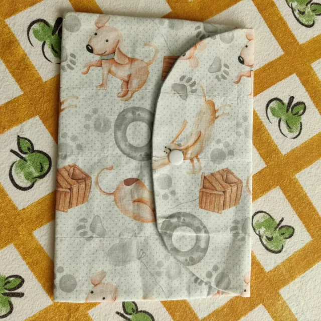 Bolsa artesanal com um divertido padrão de cães e ossos. Fecho de botão. - Tecido com padrão de cães, patas e ossos. - Fecho de botão branco. - Acabamento artesanal.