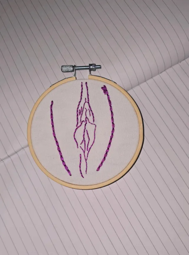 Bordado artístico em bastidor. - Desenho em linha roxa. - Bastidor de madeira.