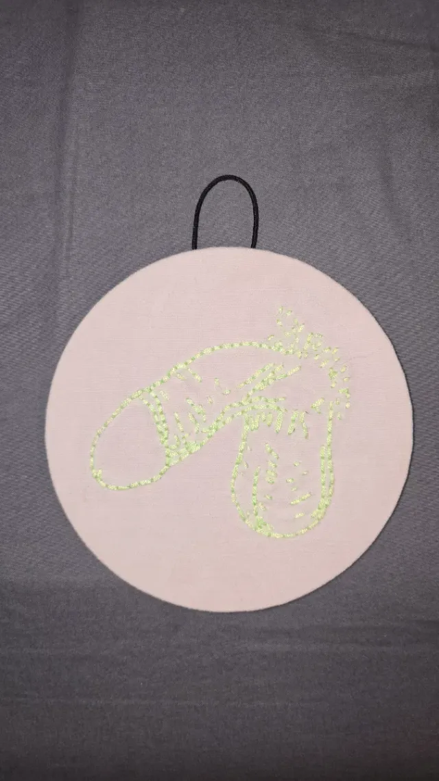 Peça de bordado feita à mão em bastidor. - Desenho em linha verde. - Tecido de fundo claro.