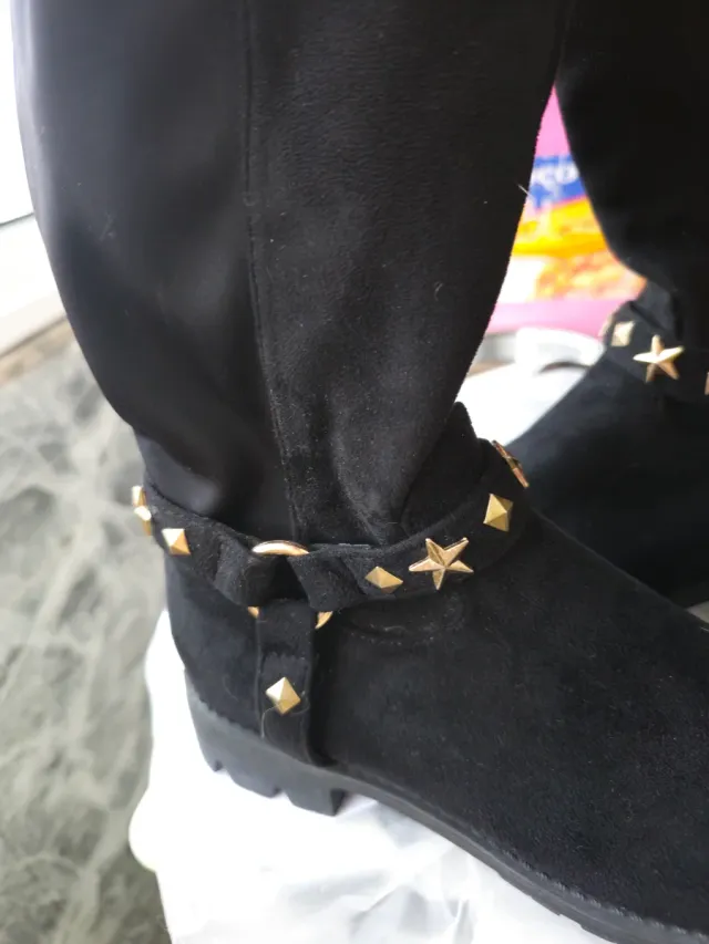 Botas pretas até o joelho com detalhes dourados