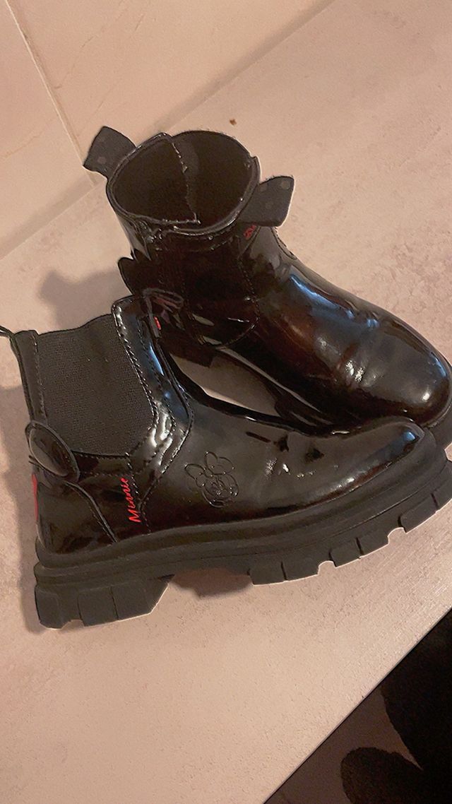 Botas pretas com detalhes da Minnie para menina. - Acabamento em verniz. - Detalhes em vermelho. - Estampa da Minnie. - Sem arranhões - Usado uma vez