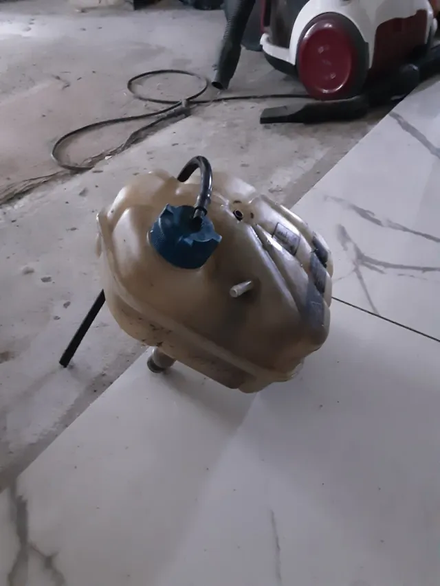 Botella de expansión para Alfa Romeo 166. Pieza de plástico de color beige con tapón azul. - Incluye manguera negra.