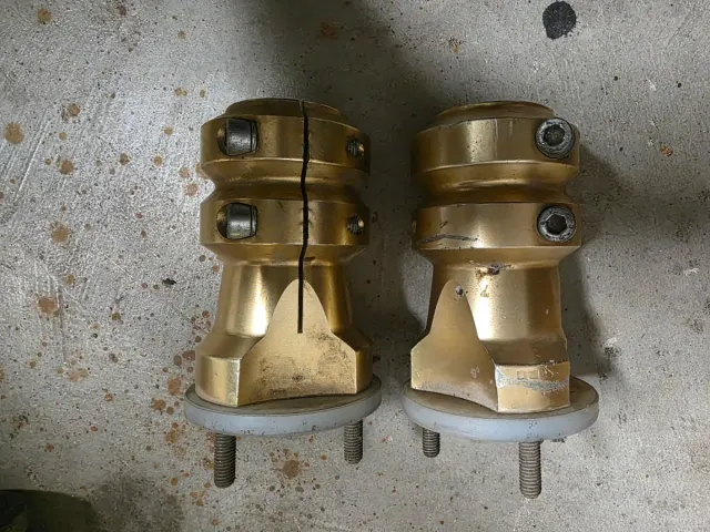 Conjunto de bujes traseros de metal dorado con un diámetro de 40mm. - Material: Metal dorado. - Diámetro: 40mm. - Diseño con dos piezas unidas por tornillos.