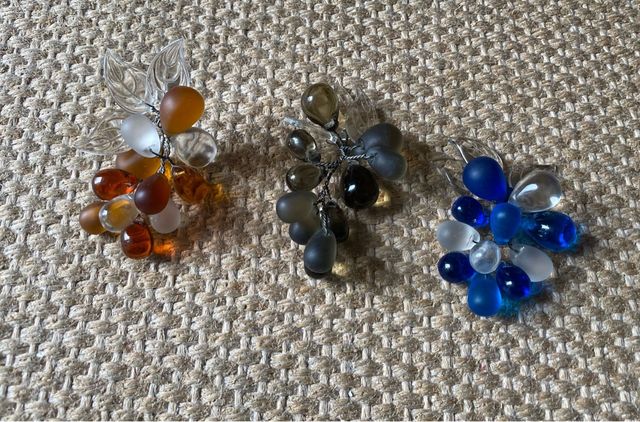 Detalhes do produtoConjunto de cachos de uvas decorativos em vidro, com um design que remete aos anos 60. Cada cacho é composto por uvas em diferentes tons e acabamentos, algumas translúcidas e outras foscas, unidas por um arame fino e com detalhes de folhas em vidro transparente.