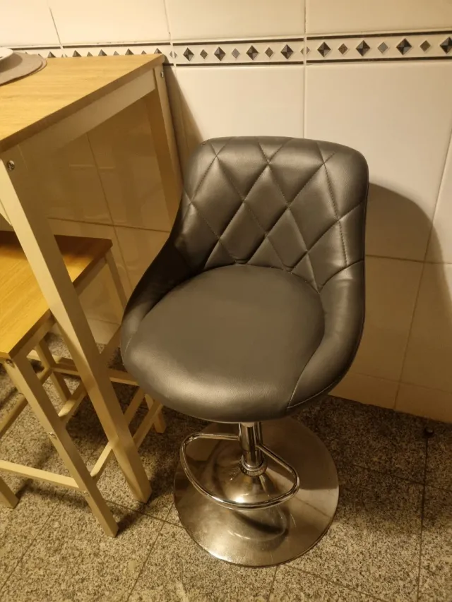 Detalhes do produtoCadeira giratória com design moderno e elegante, perfeita para bancadas ou bares. O assento é estofado e o encosto tem um padrão acolchoado.