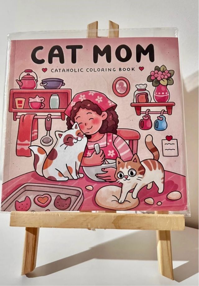 Caderno de pintar Cat Mom com tema de gatos e culinária. - Capa com ilustração de uma mãe e seus gatos. - Título: Cat Mom. - Subtítulo: Cataholic Coloring Book.