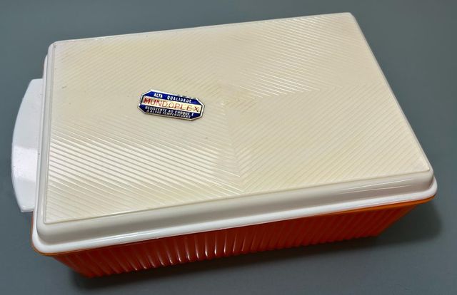 Detalhes do produtoCaixa plástica retangular dos anos 80/90 Apresenta um design canelado retro / vintage com cor laranja vibrante. Com tampa e uma base interior. É um item colecionável de cozinha vintage. Nova e nunca utilizada. Fabrico Português da marca Mundoplex. Dimensões: Largura: 18cm Comprimento: 27cm Altura: 7,5cm