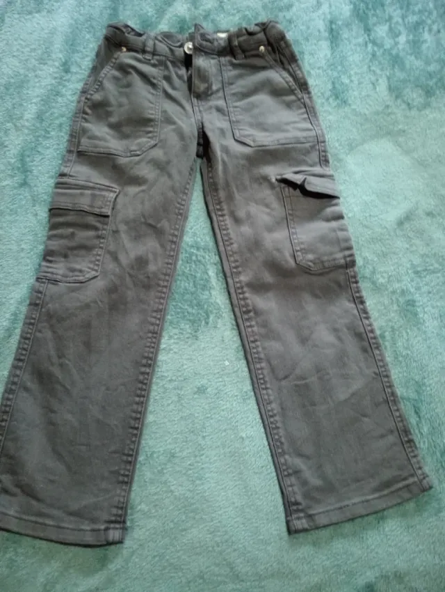 Calças cargo de ganga para menina, tamanho 7/8. Cor cinza escuro. - Bolsos laterais com fecho. - Cintura com elástico e cordão. - Pespontos reforçados nas costuras.