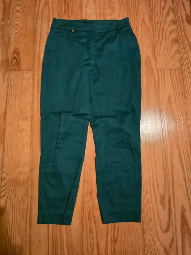 Calças clássicas da marca Cortefiel em tom verde. - Cintura com fecho e botão. - Bolsos frontais. - Perna direita. - Bainha com abertura.