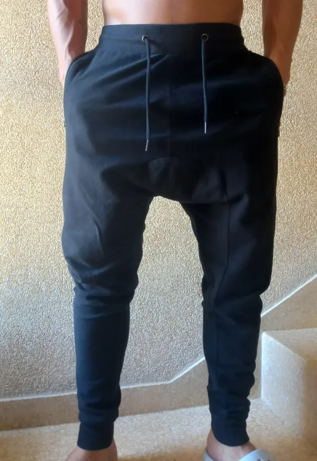 Calças pretas com um corte moderno e confortável. - Cintura com cordão ajustável. - Bolsos laterais. - Tecido macio e flexível.