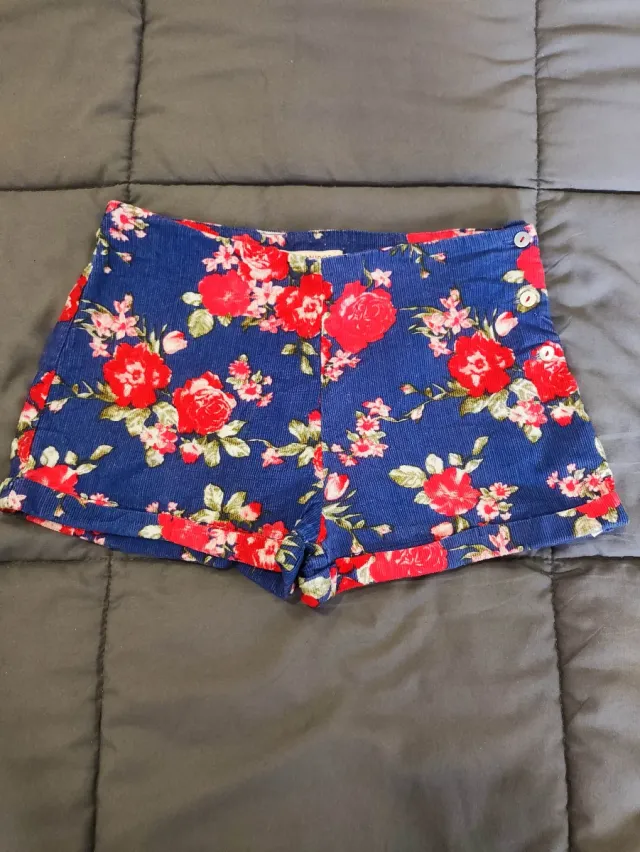 Calções de bombazina fina azul com padrão floral vermelho e verde. - Cintura subida. - Fecho de botões. - Bainha dobrada.