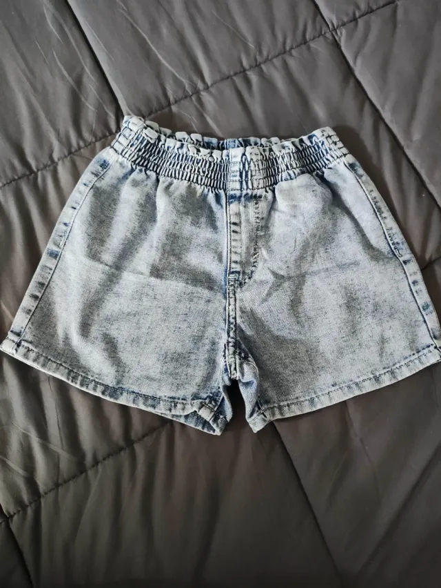 Calções H&M em ganga, em excelente estado, como novos. - Tamanho 5/6 anos. - Cintura elástica. - Efeito desbotado.