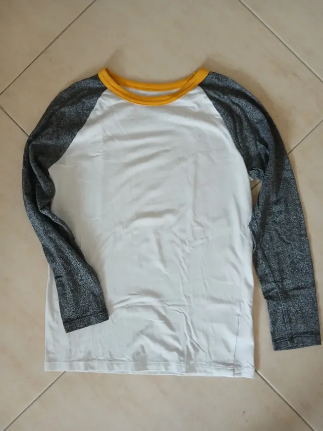 Camiseta manga raglan branca e cinza amarela