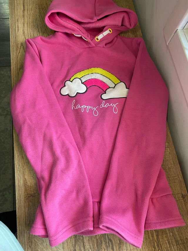 Detalhes do produtoCamisola rosa de criança, com capuz e um bordado de arco-íris e a frase "Happy Day". Está em bom estado.