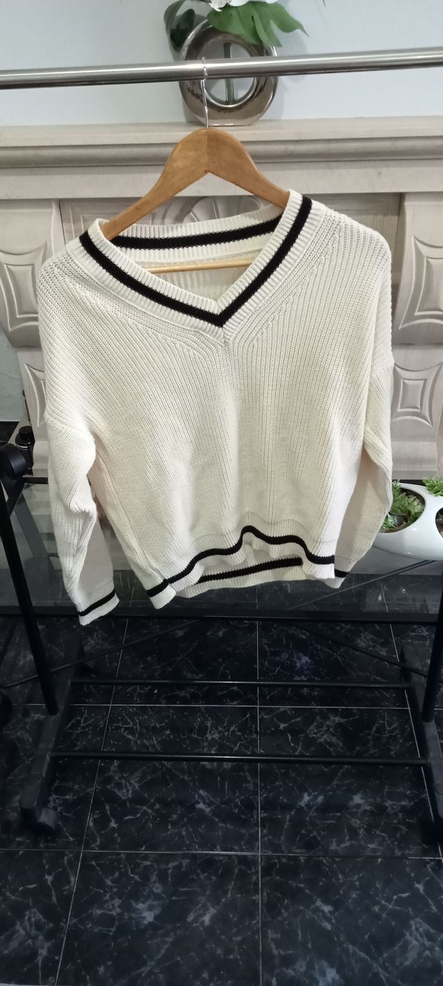 Camisola Creme Gola V com Riscas Pretas
