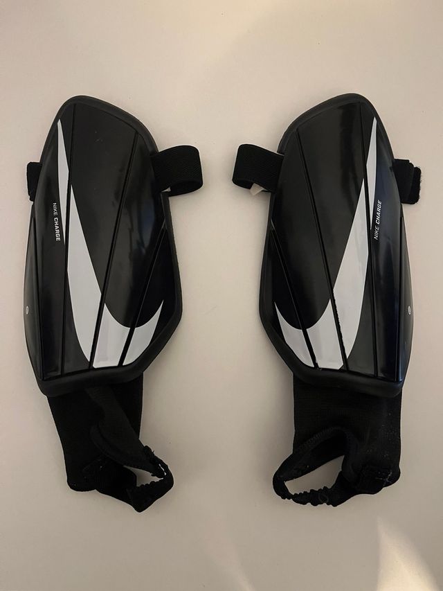Caneleiras Nike Charge em preto. - Design moderno com swoosh branco. - Tiras ajustáveis para maior segurança. - Material resistente para proteção.