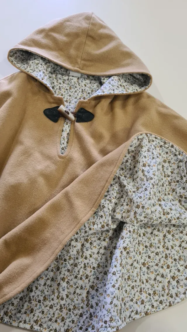 Detalhes do produtoCapa com capuz em tecido macio,50% lã e 50% poliester, forrada com tecido estampado floral em algodão.