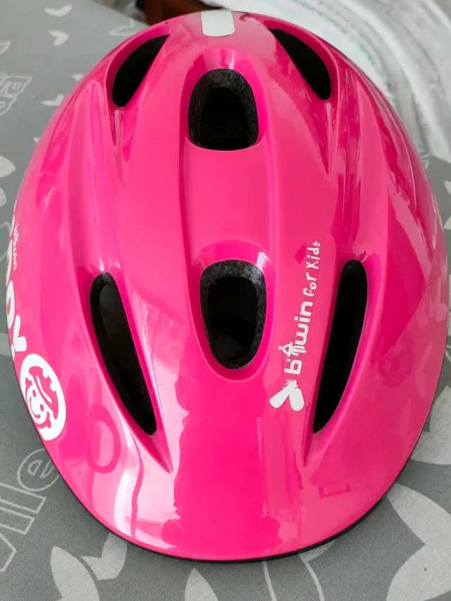 Detalhes do produtoCapacete rosa da marca B'twin para criança, com tamanho ajustável entre 52 e 56 cm.