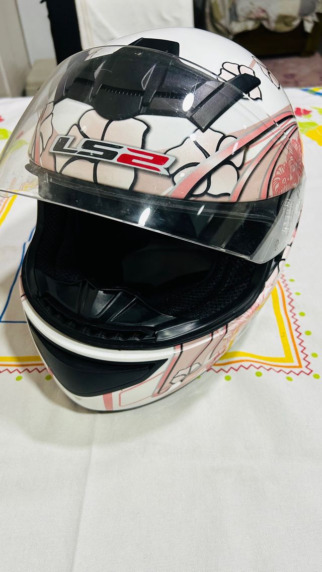 Capacete LS2 com um design floral branco e rosa. - Fecho de segurança. - Viseira transparente. - Interior confortável.