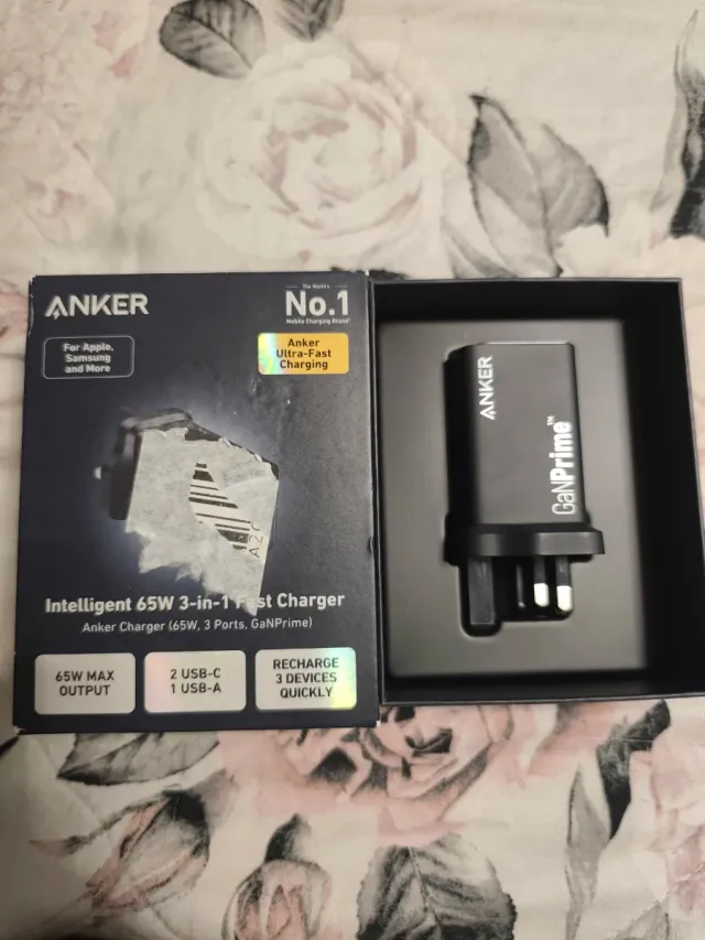 Carregador inteligente Anker com tecnologia GaNPrime. - 65W de potência máxima. - 2 portas USB-C. - 1 porta USB-A. - Recarrega 3 dispositivos rapidamente.