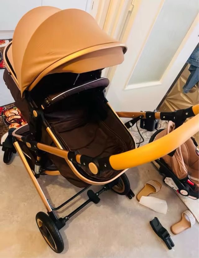 Detalhes do produtoCarrinho de bebé versátil e elegante, com capota expansível e estrutura em dourado.