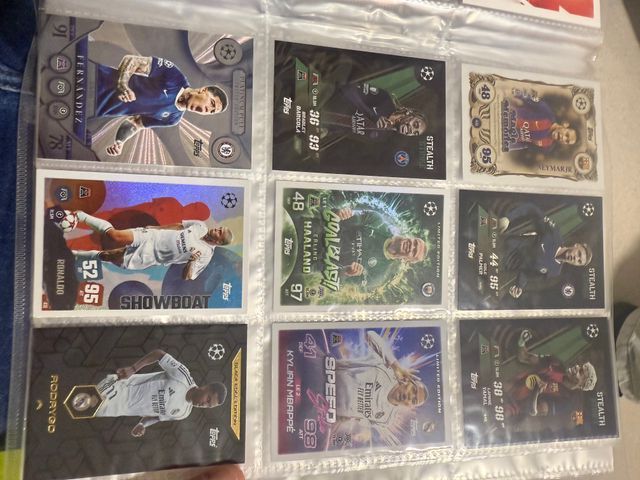 Coleção de cartas Match Attax 2025/2026. - Cartas em bom estado. - Inclui cartas de jogadores como Fernandez, Ronaldo, Haaland, Neymar Jr, Rodrygo, Mbappé e Yamal.