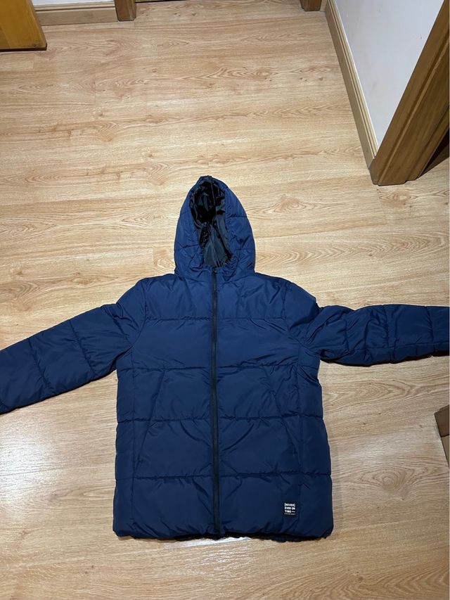 Casaco acolchoado com capuz, ideal para o frio. - Cor: Azul escuro - Com capuz - Fecho de correr frontal