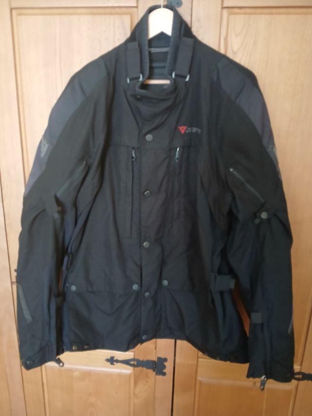 Detalhes do produtoCasaco Dainese D-Dry (Impermeável), tamanho 58 XXL, Com proteções de ombros e cotovelos, não tem forro de inverno mas pode aplicar um. Apresenta uma marca na manga esquerda mas não está rasgado e falta um botão de ajuste da manga direita (existem botões idênticos no aliexpress para quem quiser recuperar, são os de 17mm).
