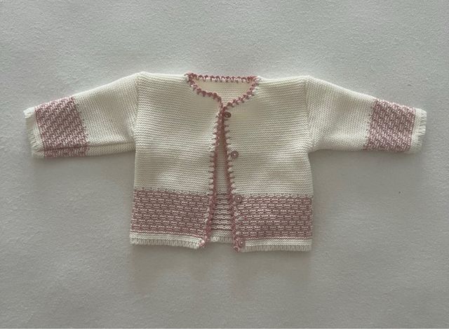 Detalhes do produtoCasaco de malha para bebé, em branco com detalhes em rosa escuro