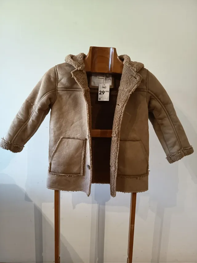 Casaco de criança com forro de pêlo. - Material exterior em camurça sintética. - Gola com pêlo. - Bolsos frontais.