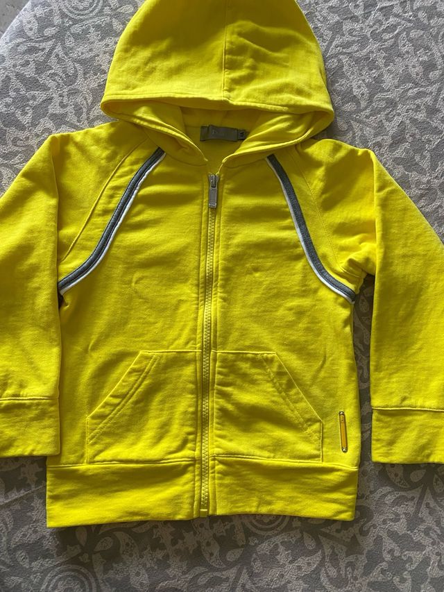 Casaco com capuz da marca Dior, tamanho 4 anos, na cor amarela. - Fecho de correr frontal. - Bolsos frontais. - Detalhes em cinza e branco nas mangas.