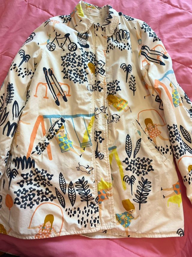 Detalhes do produtoCasaco infantil com um estampado divertido de um parque infantil, com crianças, bicicletas e árvores. Marca brasileira: Fábula