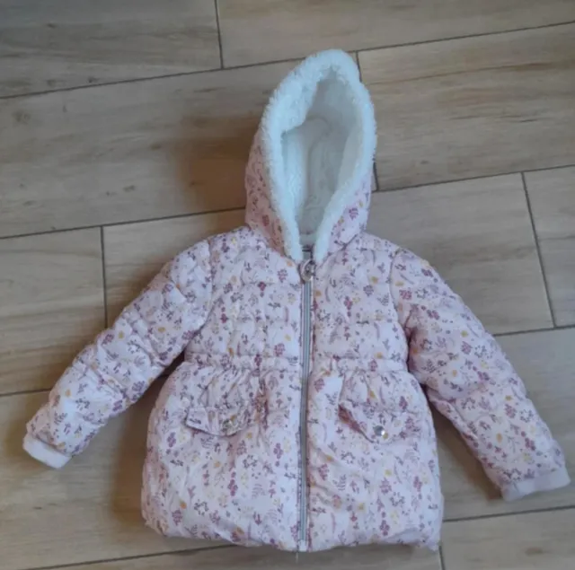 Casaco acolchoado com padrão floral e forro de pelo. - Tamanho: 24-36 meses - Capuz com forro de pelo - Fecho de correr frontal - Bolsos frontais com botões