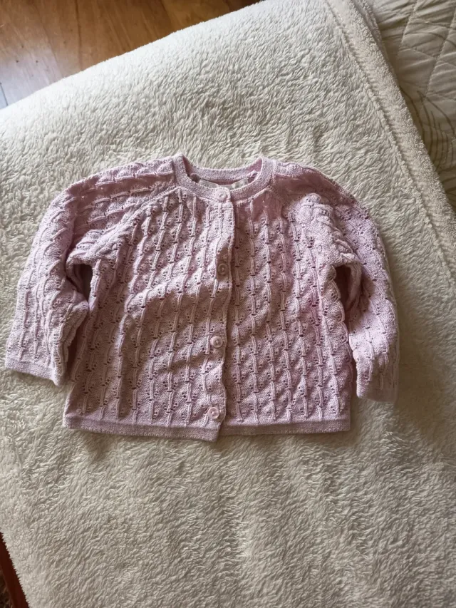 Casaco de malha para criança da Zara, em tom rosa claro. Perfeito para os dias mais frescos. - Malha com padrão texturizado. - Fecho com botões à frente. - Gola redonda.