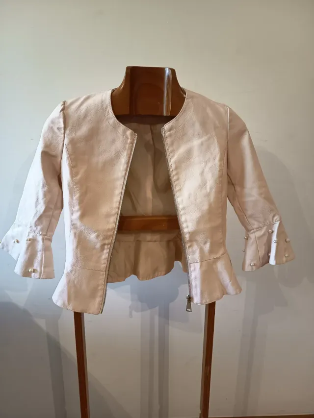 Casaco em napa para criança, com um design elegante e detalhes encantadores. - Mangas com folhos e pérolas. - Fecho frontal. - Gola redonda.