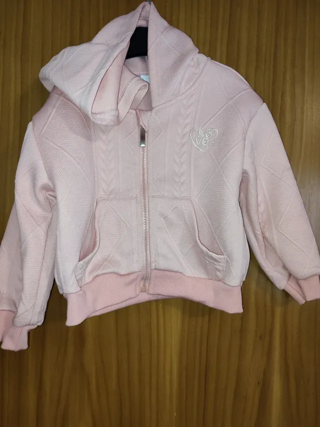 Detalhes do produtoCasaco rosa com capuz e fecho frontal. Possui um padrão texturizado em toda a peça e um pequeno bordado no peito.