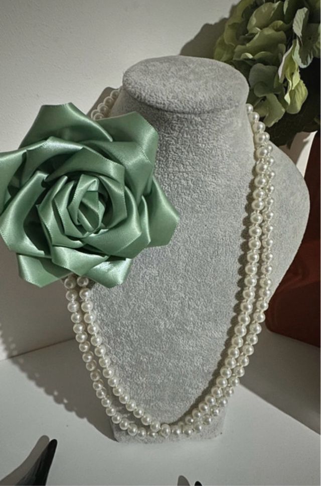 Colar com flor verde e pérolas