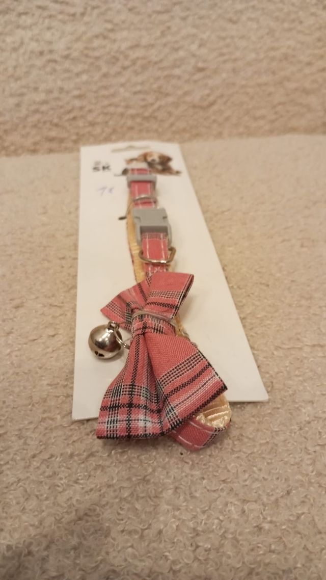Coleira para gato, nova, com laço e sino. - Coleira rosa e bege com padrão xadrez. - Fecho de plástico. - Acompanha laço e sino.