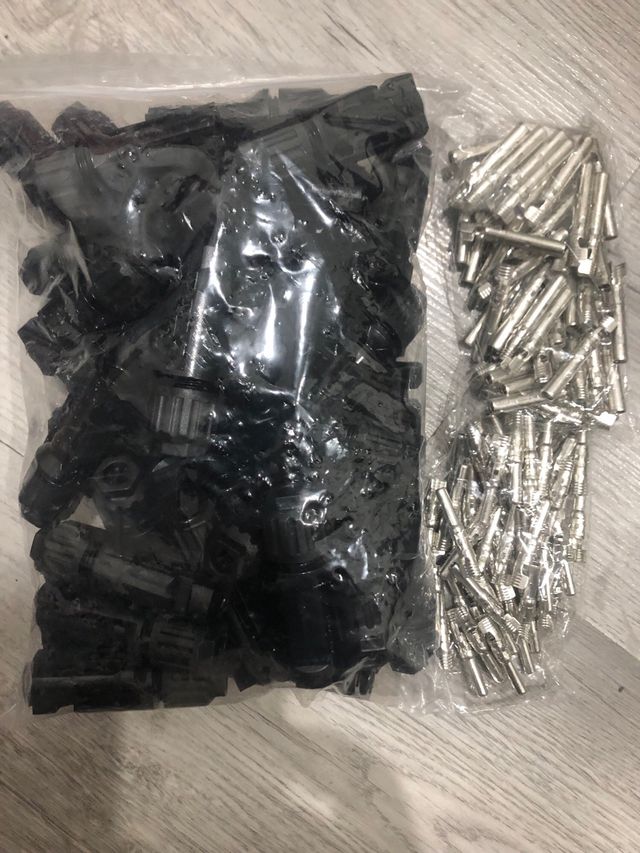 Conjunto de conectores para painel solar. - Conectores pretos. - Terminais metálicos.