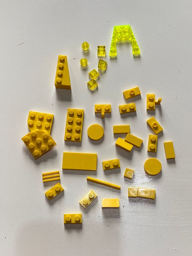 Conjunto de 65 peças Lego em tons de amarelo e laranja. - Peças variadas para construção. - Inclui peças transparentes em amarelo neon.