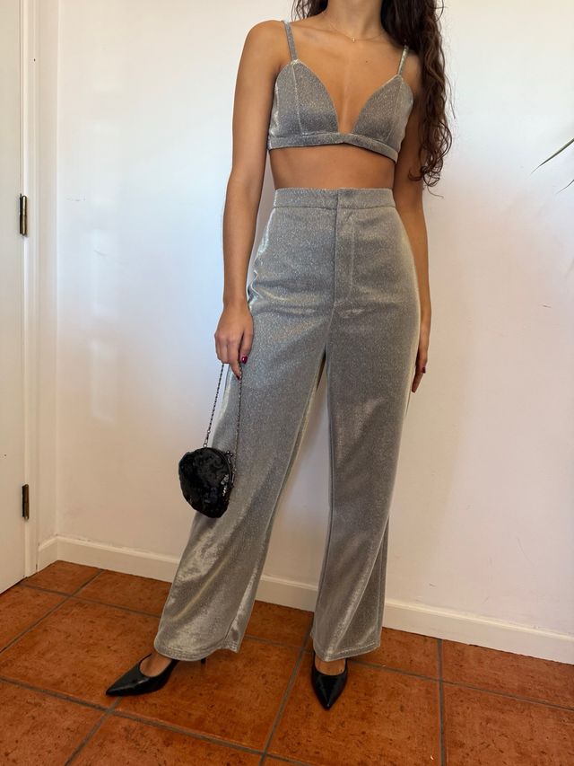 Conjunto Lurex Prateado Calças e Top
