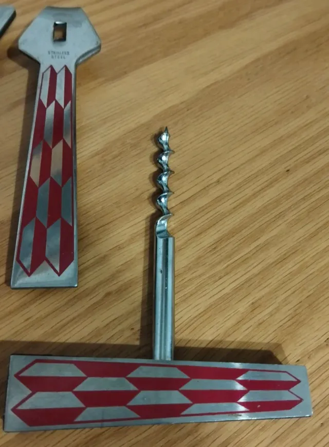 Conjunto de utensílios de cozinha em metal com detalhes em vermelho e prata. - Saca-rolhas com espiral. - Saca-caricas. - Abre-latas.