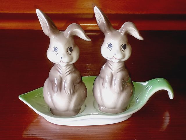 Detalhes do produtoSaleiro e pimenteiro em cerâmica em forma de coelhos sobre uma folha