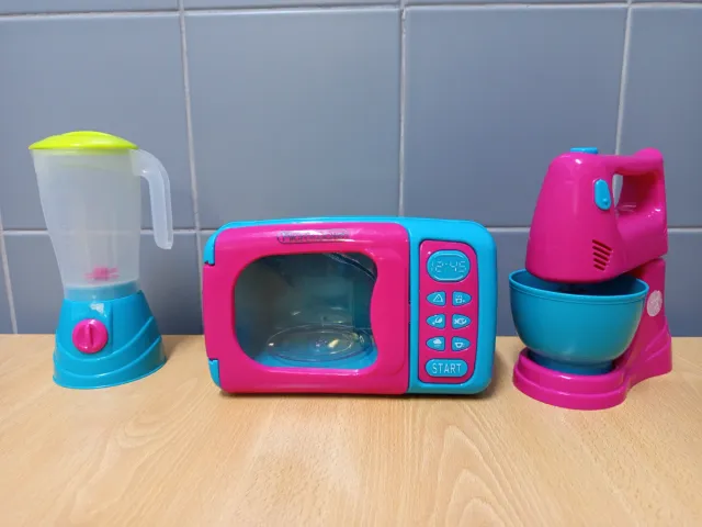 Conjunto de utensílios de cozinha de brincar. - Inclui um liquidificador, um micro-ondas e uma batedeira. - Cores vibrantes em rosa e turquesa.