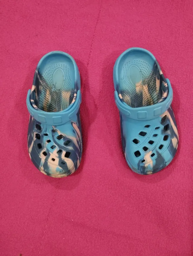 Par de Crocs infantis em azul com um padrão divertido. - Tamanho 26/27. - Design com aberturas para ventilação.