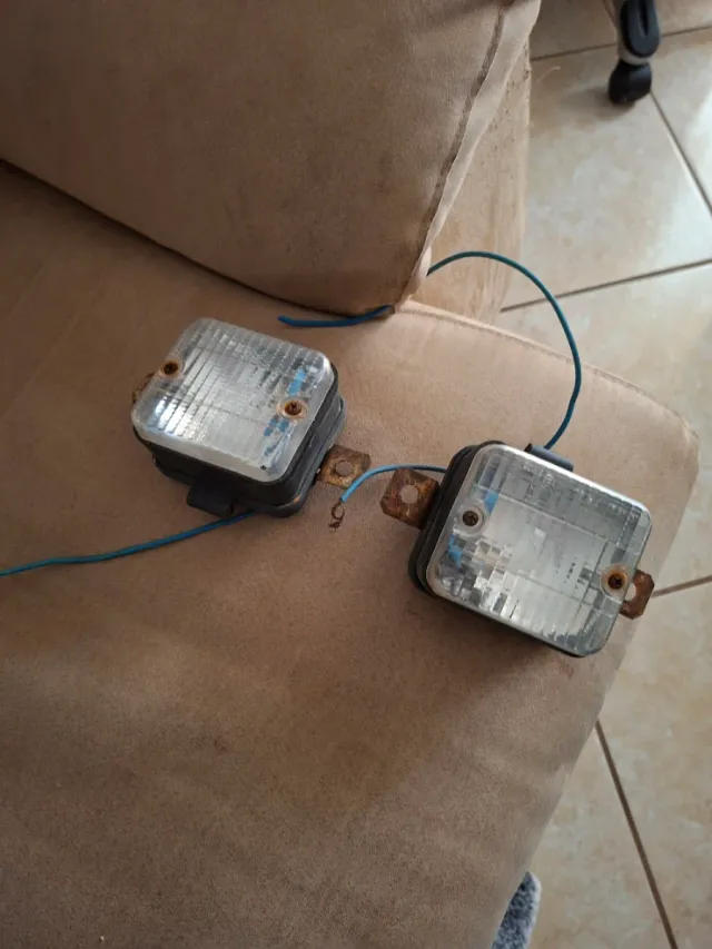 Conjunto de dois farolins para atrelado ou reboque. - Lentes transparentes com padrão. - Suportes metálicos. - Usados a funcionar.
