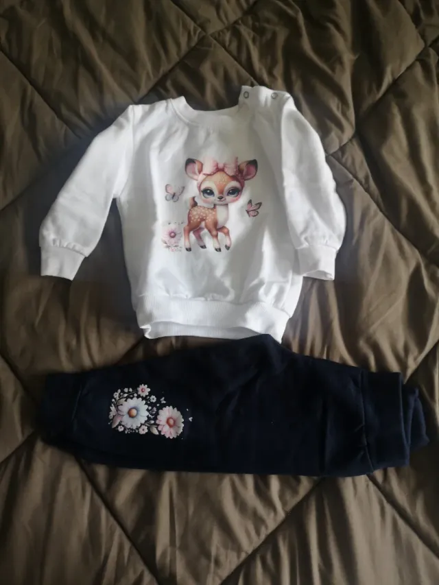 Conjunto de fato de treino para menina com estampa de Bambi. - Camisola branca com estampa de Bambi e borboletas. - Calças azuis escuras com estampa floral. - Cardado